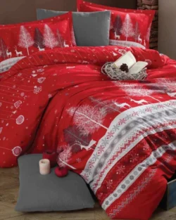 Створіть у спальні справжню магію свята з комплектом постелі Clasy New Year’s! Яскравий червоний колір, засніжені ялинки, білі олені та скандинавські орнаменти миттєво наповнюють кімнату атмосферою Різдва та затишку. Комплект виготовлено з якісного та практичного ранфорсу (100% бавовна).