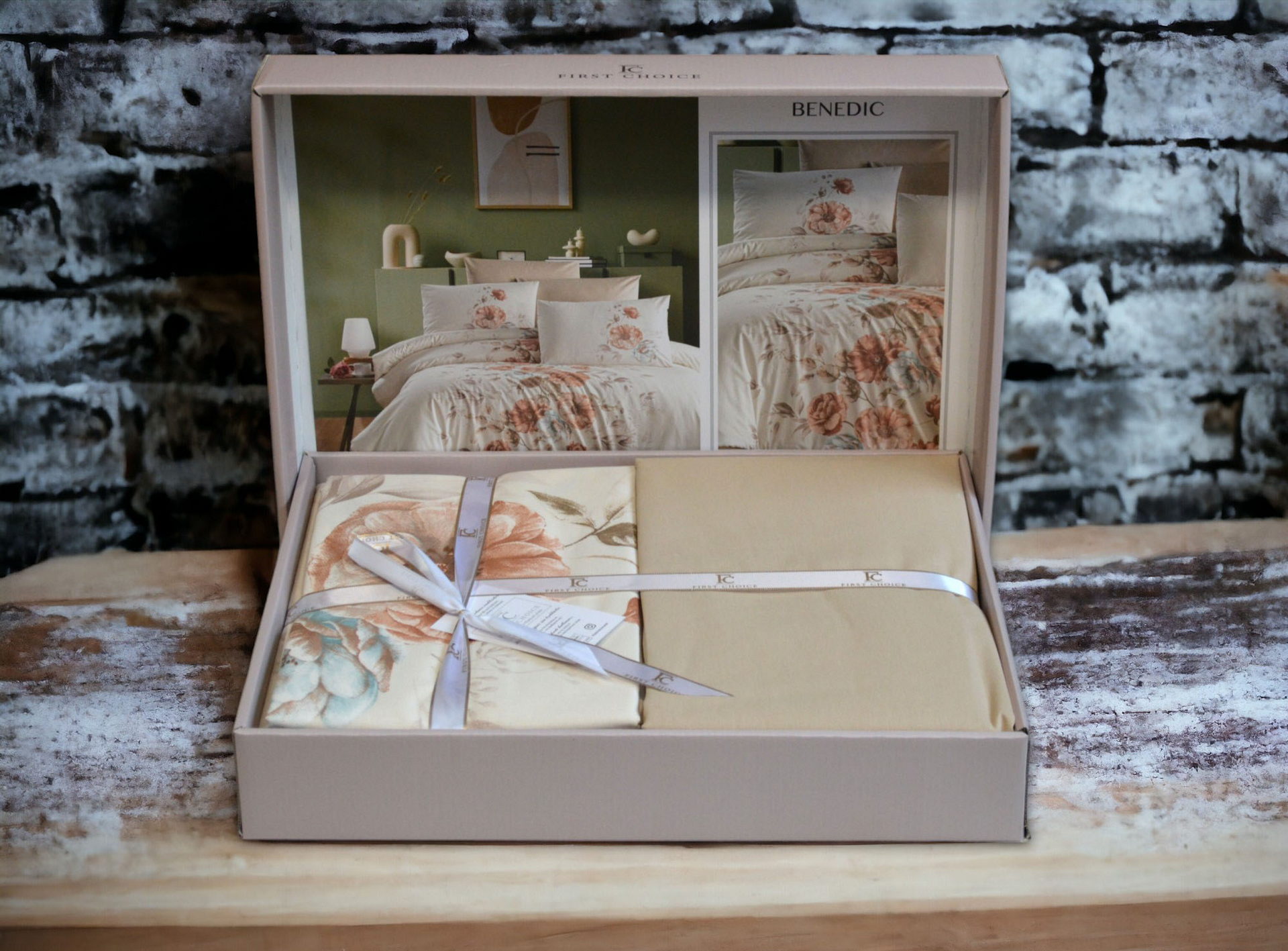 Постільна білизна Benedic Cappuccino від First Choice — це справжня картина у вашій спальні. На теплому, затишному фоні кольору капучино розквітає великий художній принт півоній. Палітра з відтінків теракоти, пильної троянди та приглушеного синього створює глибокий, насичений та водночас ніжний образ. Цей комплект стане ідеальним вибором для створення романтичної та елегантної атмосфери.