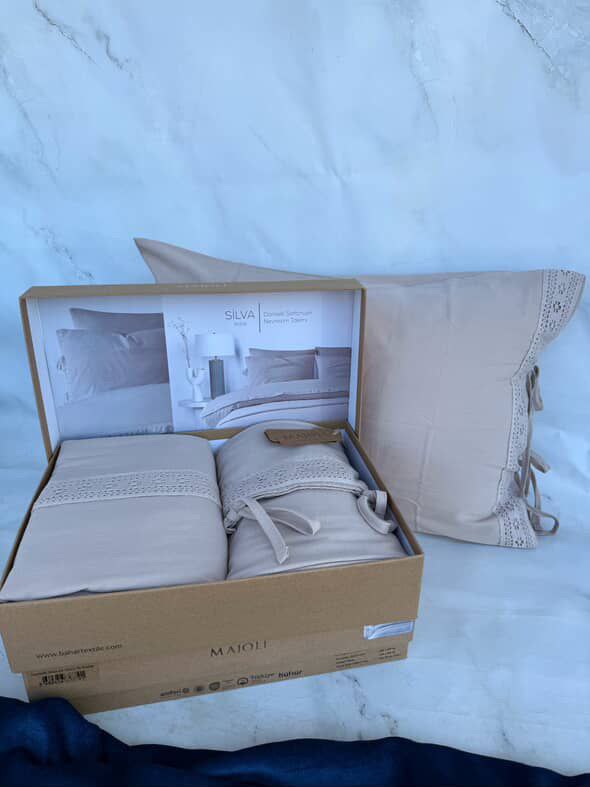 Majoli — це унікальне поєднання натуральної тканини та розкішного дизайну. Комплект має ніжний відтінок, прикрашений делікатним гіпюром, що додає шарму та романтики. Турецька якість — гарантія довготривалого комфорту.